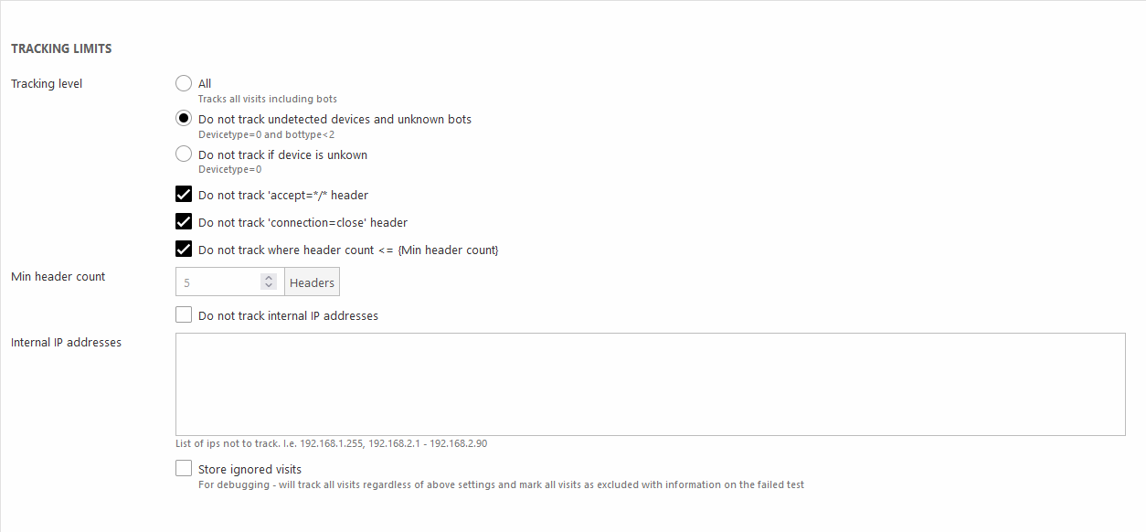 - Do not track where header count <= {min header count} – most “real” request contains at least 5 headers, so requests with fewer headers are typically bots or other non-human actors