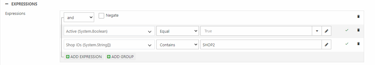 Expressions may be combined in AND-groups (all expressions inside the group must be true for a product/user/page to be included in the result) and OR-groups (one of the expressions in this group must be true for a product/user/page to be included in the result). You can also check Negate for a group to return all elements not matching the expressions. All in all, this makes it possible to create pretty powerful and complex queries – although in most cases it’s not necessary to complicate things!