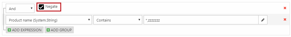 Please note that if you have multiple expressions in a negated group, each expression is evaluated individually and then negated. If you in a negated group have two expressions, and the first expression gives two results, and second expression filters to one result, then it will negate, and show all products but the one (ending up doing the opposite of what you want).