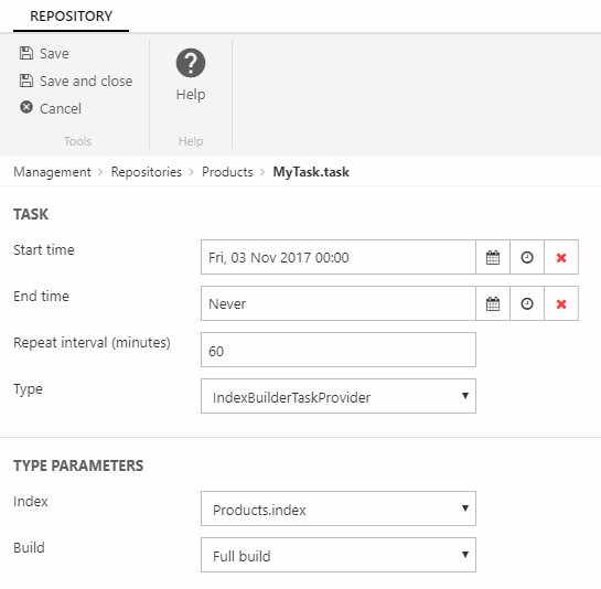 Tasks are scheduled activities which rebuild your indexes at predefined intervals. They are created on a repository and then executed by a standard scheduled task called Repository Task Handler which runs every 5 minutes. Like all scheduled tasks, this task is itself executed by a scheduled task on the server so exact timing can be tricky - and you should be careful to base important processes on it.