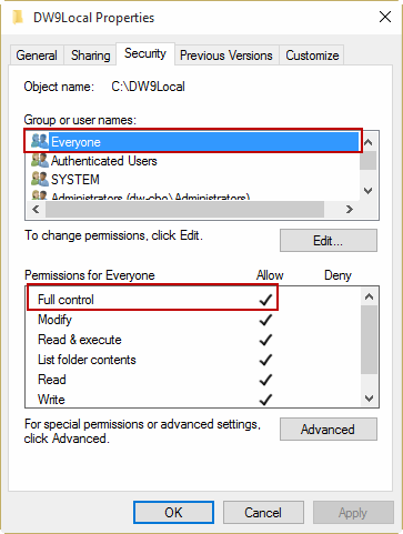 Please make sure that your user has full rights to both folders (or a top folder) – in a pinch you can add the user Everyone and give it full access (Figure 7.1)