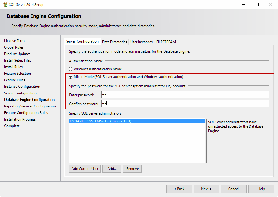 - Under Database Engine Configuration select Mixed Mode – and provide a password for the sa user (sysadmin) (Figure 4.2). (If your AD is configured correctly you can also use Windows Authentication mode – but that is outside the scope of this guide).