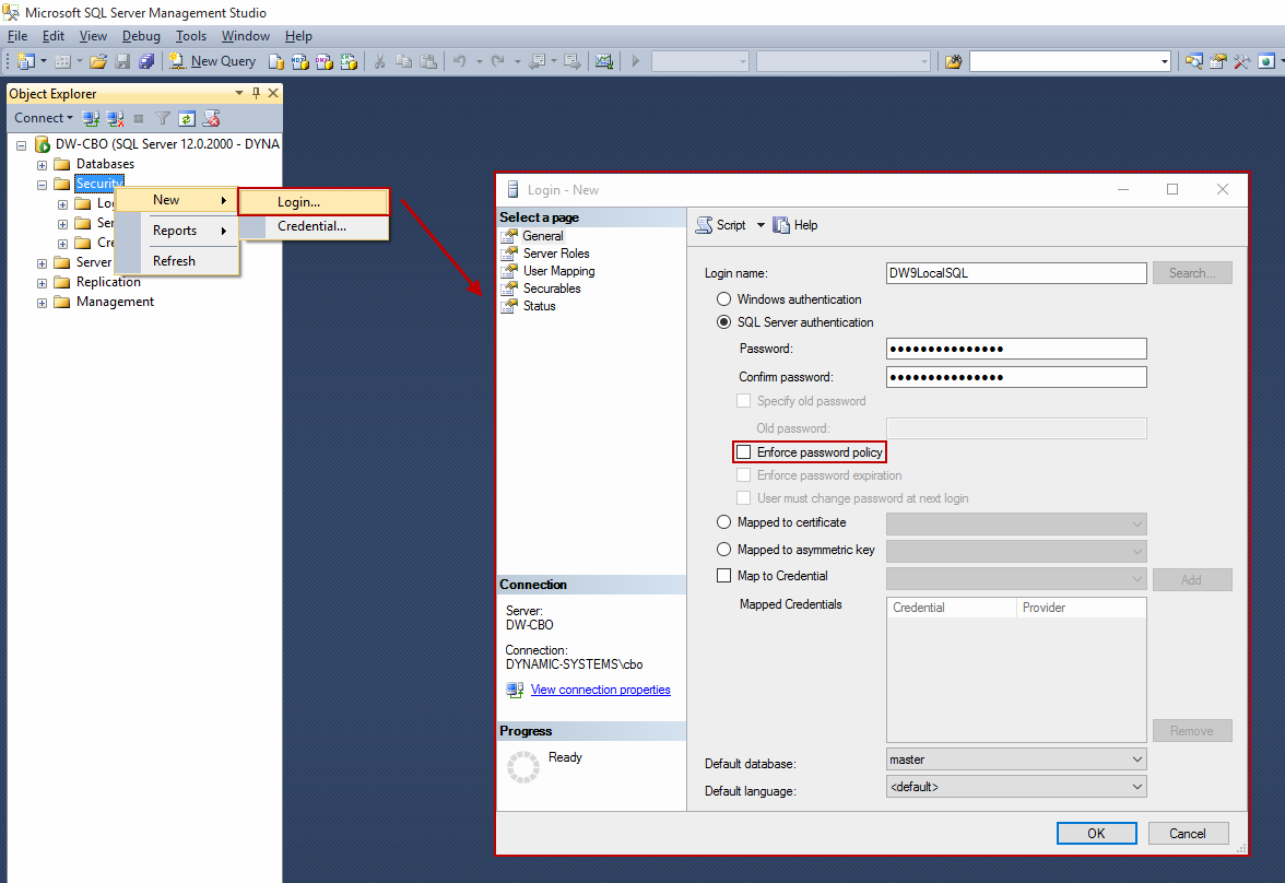 Next, you should create an SQL user with the right permissions for installing the Dynamicweb database: