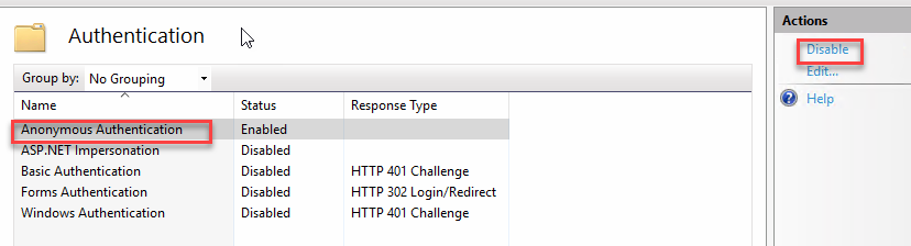 - In the Authentication menu, select Anonymous Authentication and click Disable (Figure 17.3)
