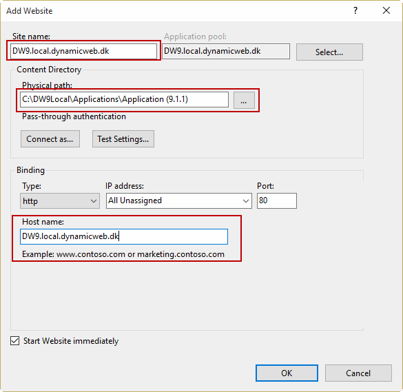 - Give it a host name – (Local installations: yoursitename.local.dynamicweb.dk, or add a record to the hosts file and use that)