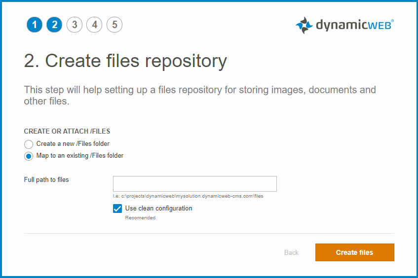 If mapping to an existing files folder, the checkbox Use clean configuration creates a clean GlobalSettings.aspx configuration file for the solution, this is recommended.