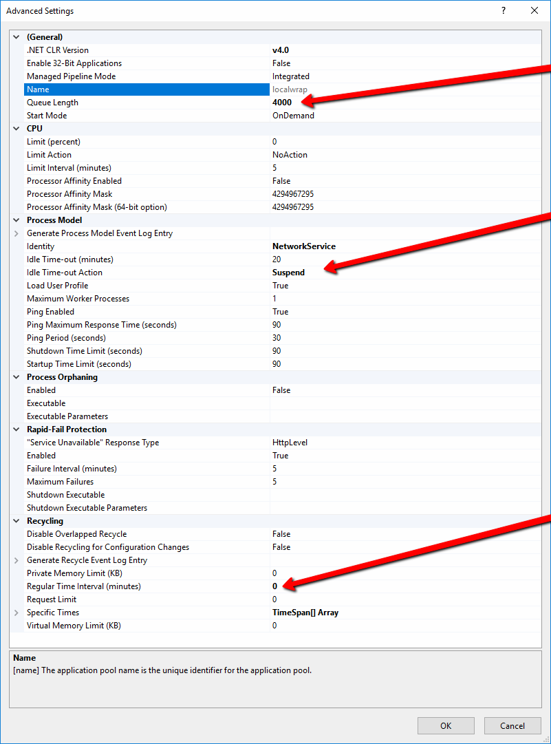 - Set the Regular Time Interval to 0 to prevent the application pool from automatically recycling at regular intervals (which is always at an inconvenient time)