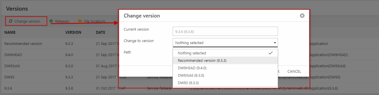 - Click Change Version in the toolbar to open the change version menu.