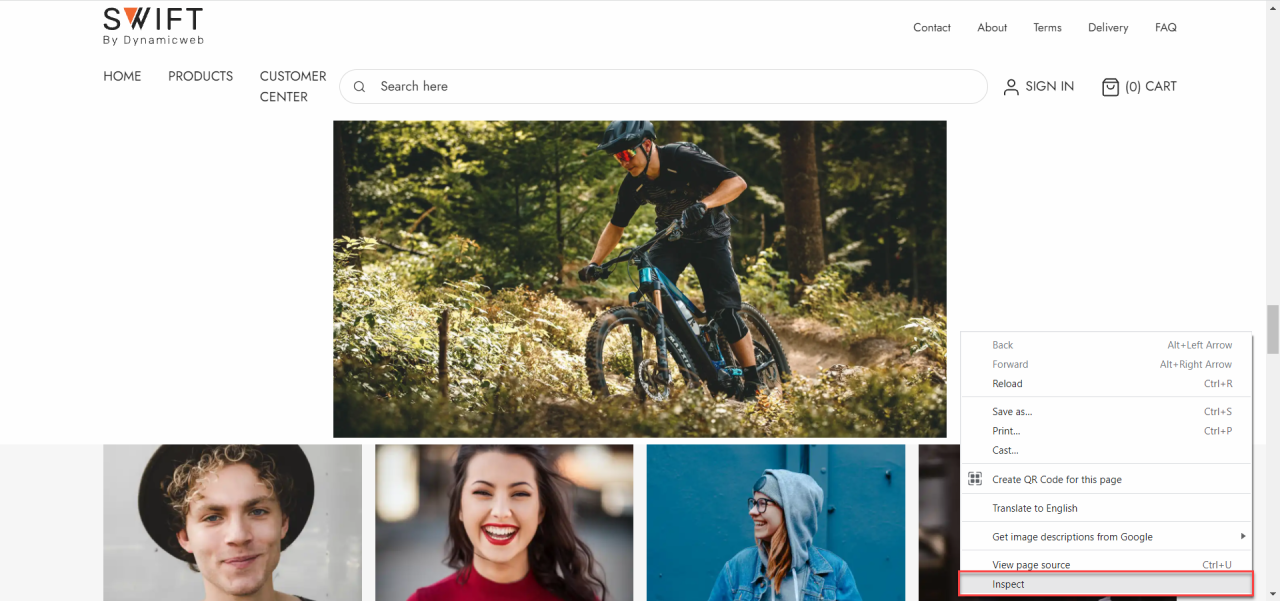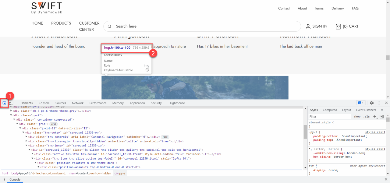 As mentioned, Swift has various ways to customize the width of the columns displayed on your page. This is also why the guidelines shown above are guidelines and not rules. If you want to be more specific about the size of your image, you have some different options. The one we’ll show is inspecting the page using the developer tool. We’ll show how to find the developer tool for Google Chrome.