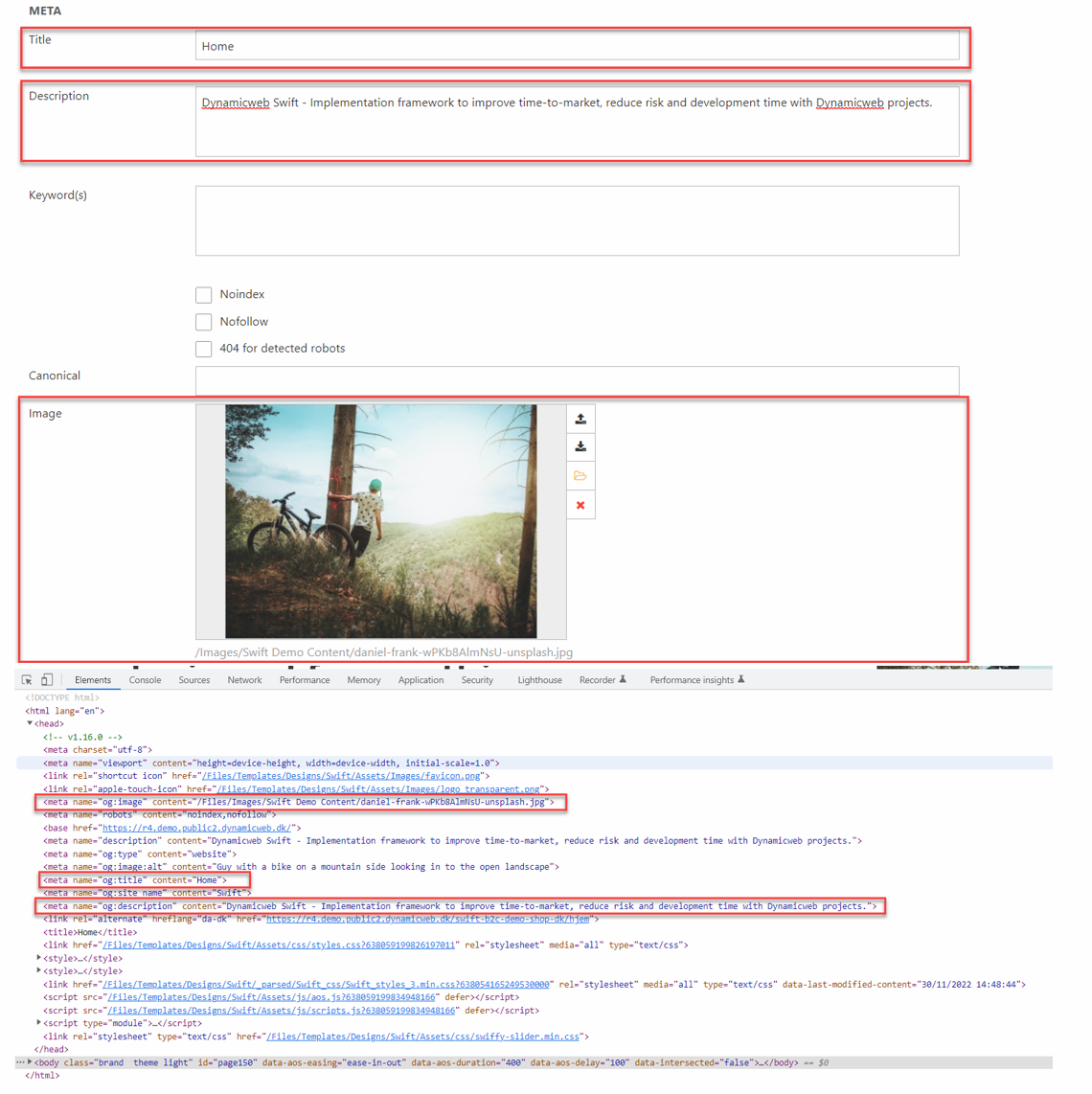 The meta data created under the page properties for a page will also be used to create Open graph data. When filled out, the meta data in the source code, will also include an og: title, og:description and a og:image value. Again, these are all based on the input added in the page properties as seen on the Figure 4.1.