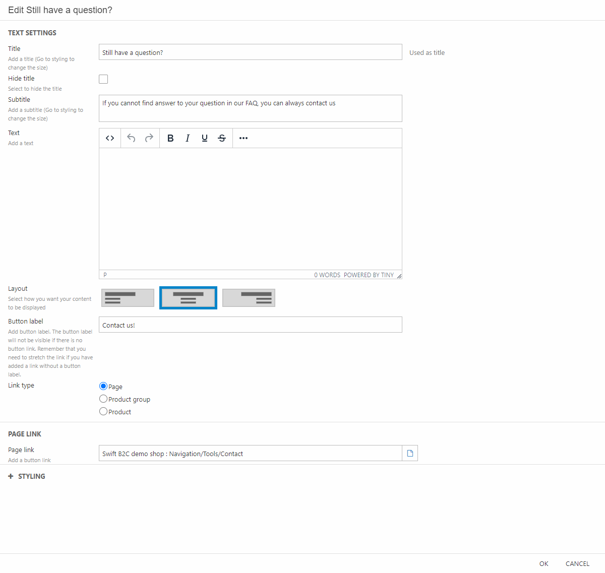 The Swift demo-website features a set of page, column, and row presets appropriate for a bike shop – you can use these as an inspiration for what can be done using the different content elements.