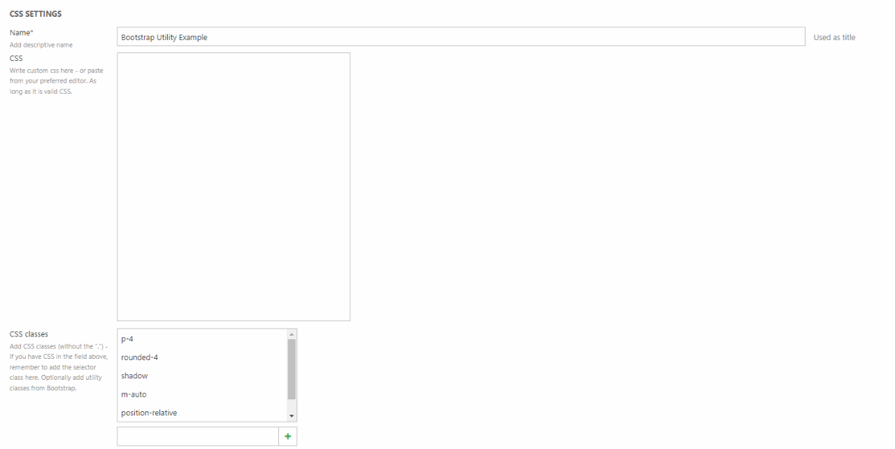 • CSS classes -  This is where you create the custom classes. Classes can be created by writing the names (excluding the ".") in the field at the bottom. Classes can be deleted by hovering them and clicking the red cross. Should you want to use utility classes from Bootstrap, this is where you add them.