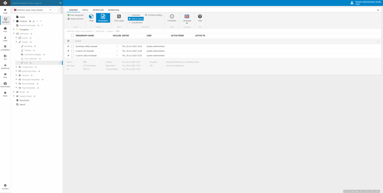 The CSS page consists of different CSS code collections – the Swift Demo site has three example collections. Just like themes can target specific elements, but is also used on a larger scale,  these collections allows you to create custom CSS code targeting specific elements such as one specific column. It also allows you to create a more general CSS code, that you might want to use on multiple rows/columns.