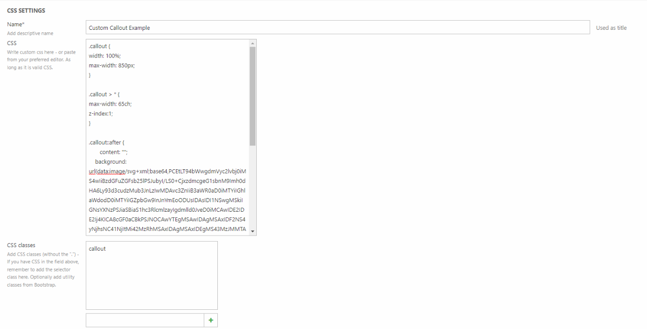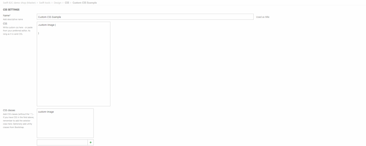 • CSS - This field is for actual CSS code. You can either write your code directly into the field or paste it from an editor. It just has to be valid CSS code. This field can be left blank intentionally, if for example you are using Bootstrap classes. The Swift Demo site has an example of this, which we will cover later on in this article.