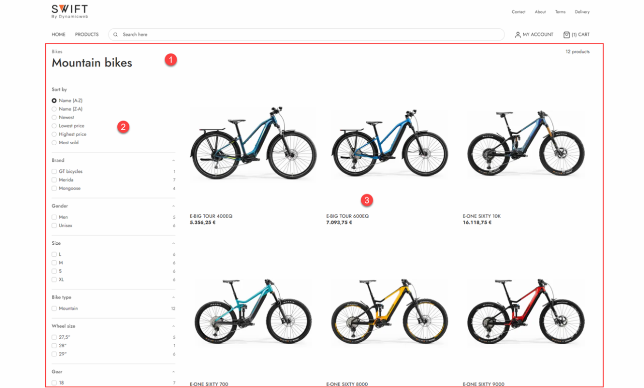 The Swift example website ships with a product list design which gives customers an overview of a specific subsection of products – here the category Mountain Bikes (Figure 1.1).