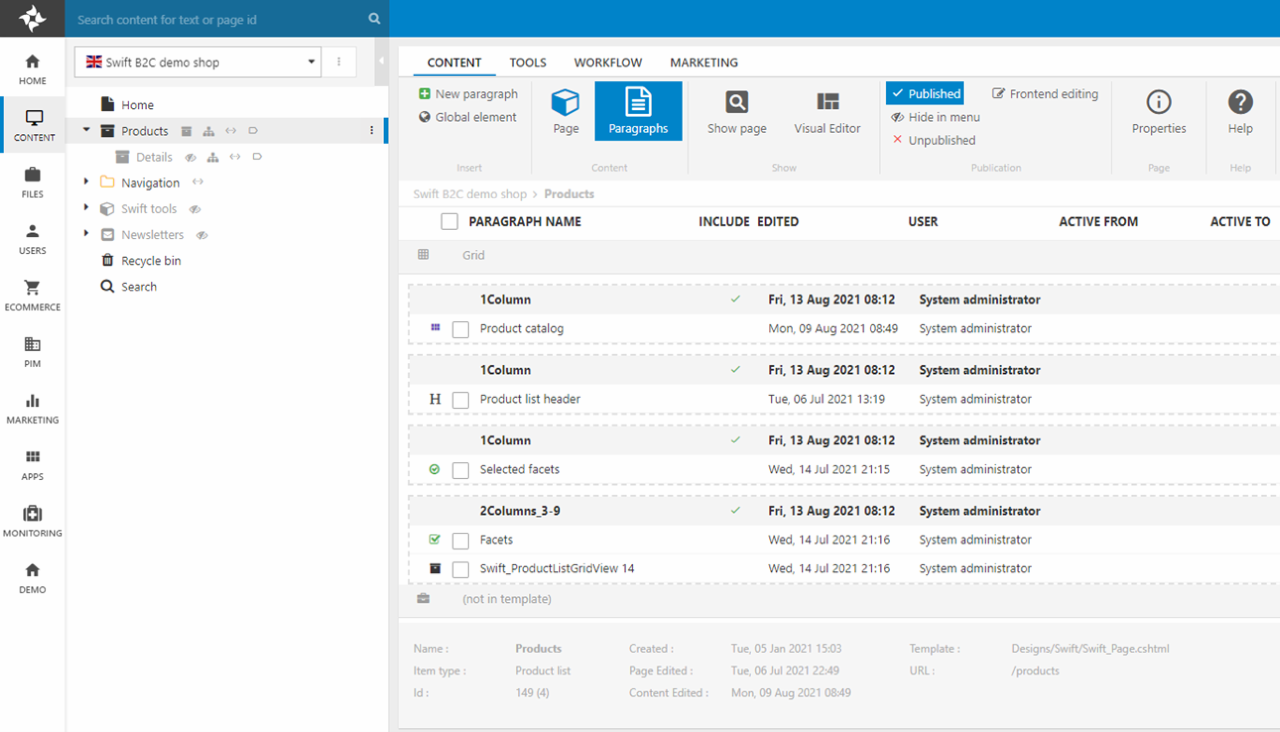 - A Swift_ProductListGridView paragraph which renders the product grid – on the item type you can tweak the look and change e.g. the image aspect ratio or include more product data in the list view