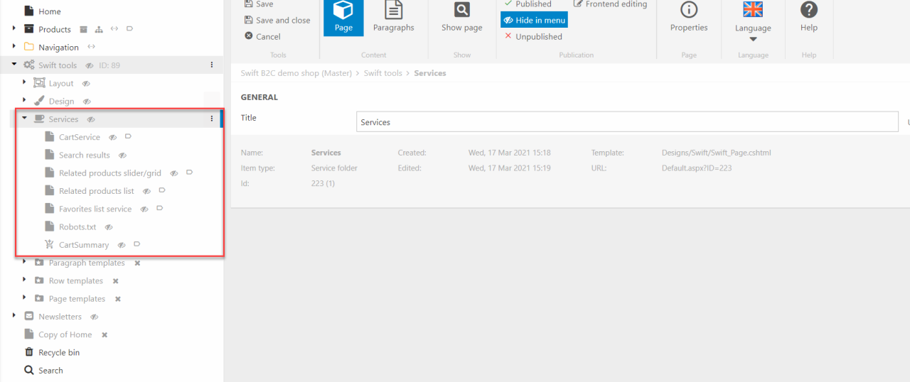 1. Create a new page in the services folder in the Swift tools folder. Call it “Product and content search results”. Make sure it is hidden in menu
