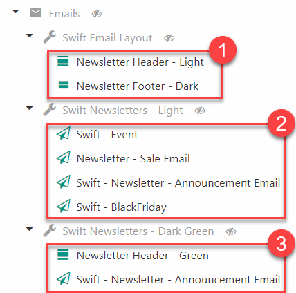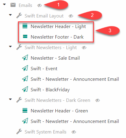 In the example below (Figure 2.2) “Swift Email Layout” (1) is meant to be the default header and footer design. “Swift Newsletters – Light” (2) is linked with the default header and footer. Meaning that emails created here will have the footer and header from “Swift Email Layout”.