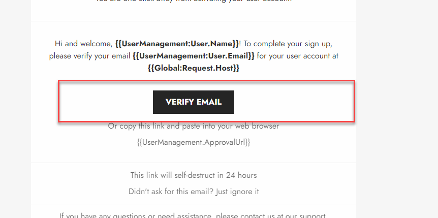 This example will be based on the verification email sent to newly created users, which is shown just above. All the columns used have been documented in the content column section.