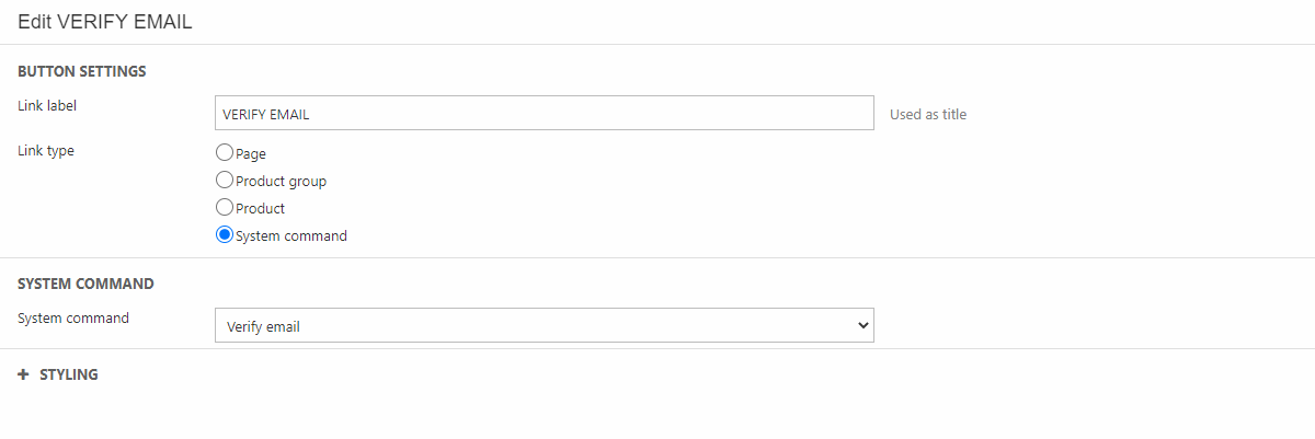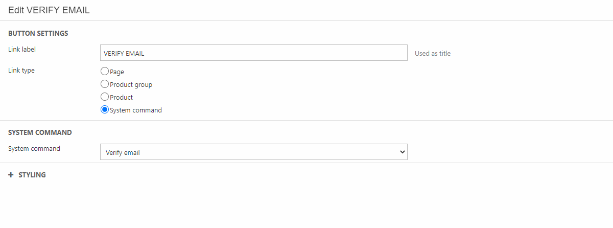 Another neat feature for system emails is buttons. In this example it is used for verifying an email. This button uses the “System command” Link type. In the System command dropdown “Verify email” is chosen (Figure 24.1). Again, this is just using an ordinary column and not some “Special-System-Email-Button-Column”.