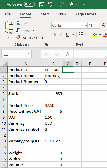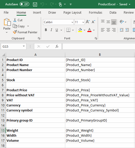 When this link is clicked, an excel sheet with the product details is downloaded (Figure 2.1) – as you can see, it is generated from the master file you downloaded. To see which placeholders are available to you add &dwtemplatetags=true to the url – this will auto-generate a help file for the context (the product details template) and download it.