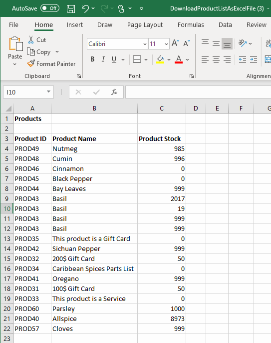 When this link is clicked, an excel sheet with a list of products is downloaded (Figure 3.1) – as you can see, it too is generated from the master file you downloaded. As in example 1, you can simply add &dwtemplatetags=true to the URL to generate a help file with information about the placeholders & loops available to you.