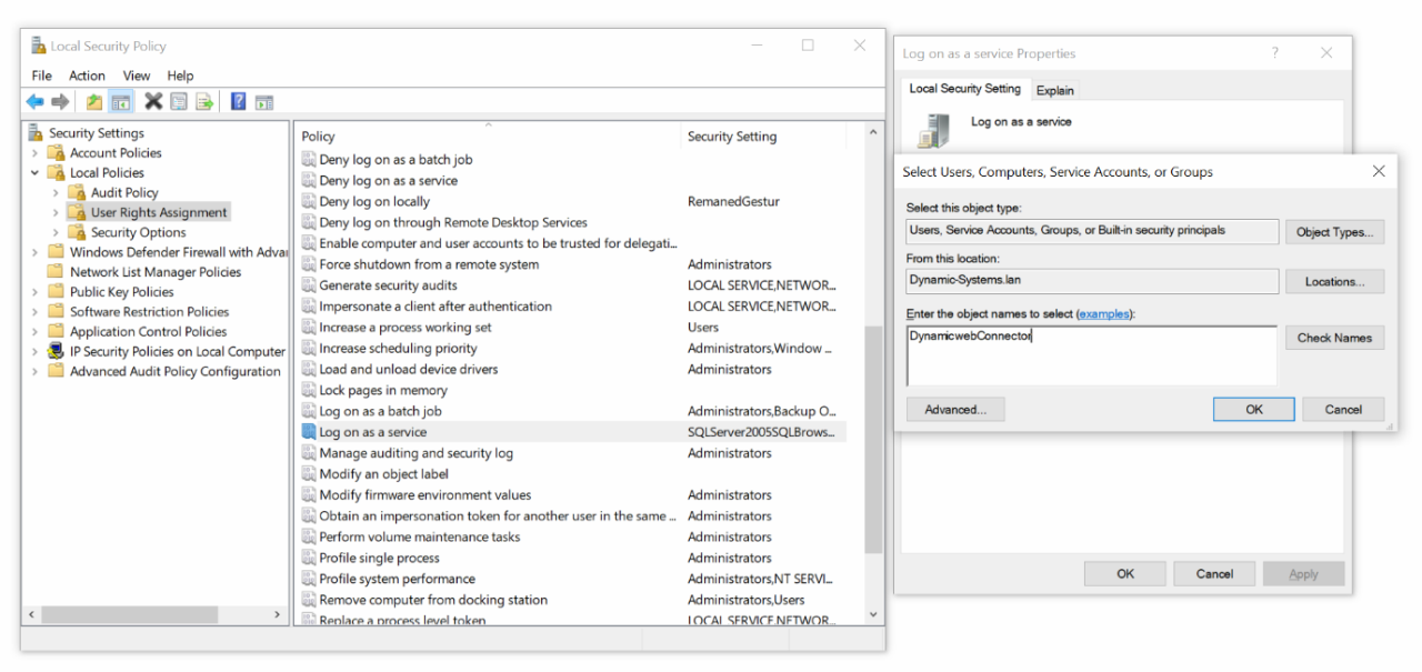 Although you can add credentials to Business Central in the configuration of the Dynamicweb Connector Services, best practice is to run the service in the context of a Windows users. Create the user and add the user to the “Log on as service” policy in “Local Security Policy”.