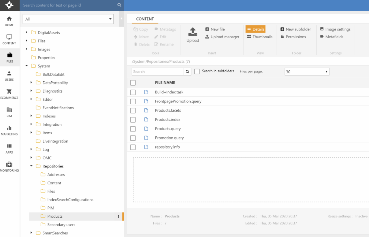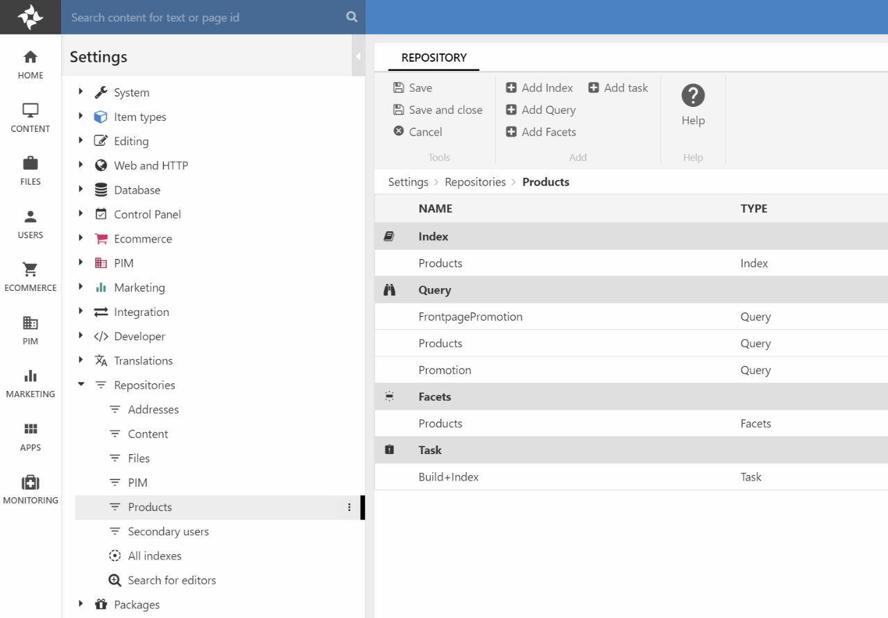 The Repositories area contains configuration of the search and filter engine in Dynamicweb. The turnkey baseline contains the necessary configuration to run the frontend web shop, but if you want to learn more about advanced searching and filtering – and I’d encourage you to do so – there is extensive documentation along with tutorials on this page: