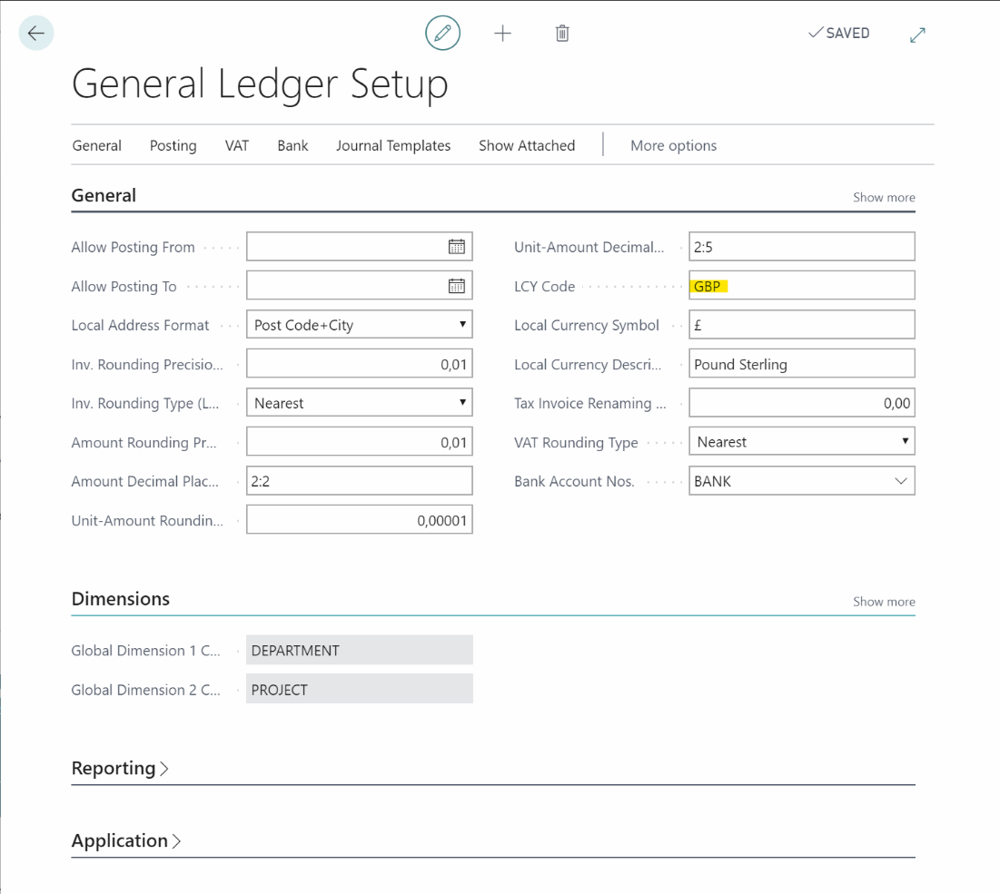 After running the initial batches, we receive a load of data from Business Central including currencies. In order for the price management to work properly, we have to set a default currency for the solution. This is the currency, which the prices in the database are stored in. It must be the same at the Local Currency in Business Central General Ledger Setup: