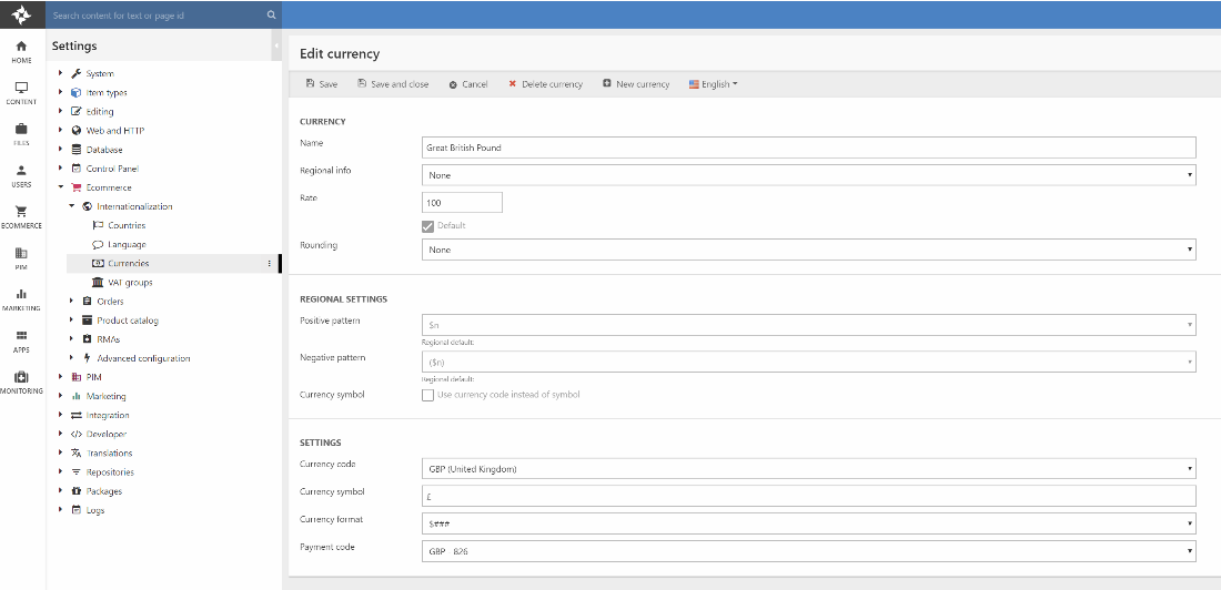 Switch to Settings -> Ecommerce -> Internationalization -> Currencies and locate the currency matching the LCY. Check the Default checkbox, apply a currency symbol and payment code and click Save. Accept the warning.