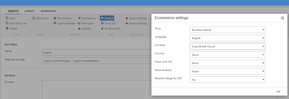 Switch to the Content area and go to the website settings, where you select the LCY currency code in the Ecommerce dialogue: